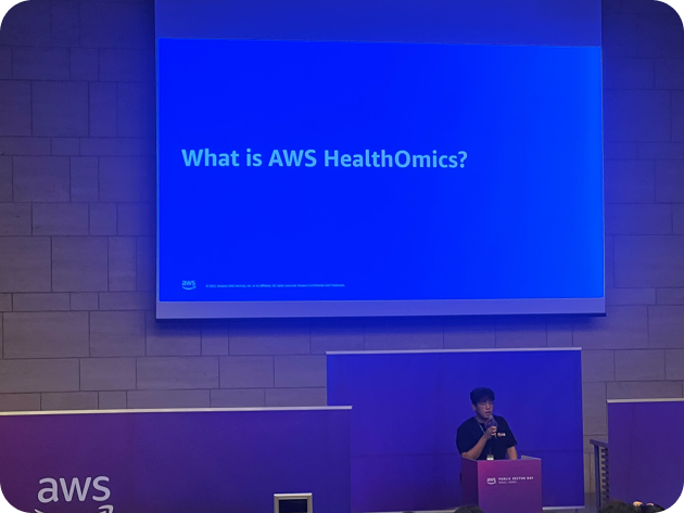 이번 행사에서 저희는 Track2 헬스케어 세션에서 고객사인 지니너스(Geninus)와 함께 “유전체 데이터 분석 혁신, AWS HealthOmics로 여는 헬스케어의 새로운 시대”라는 주제로 발표를 진행했습니다. 이번 발표는 AWS HealthOmics 국내 리전 공식 오픈과 맞물려 런칭 파트너로서의 의미를 더했으며, 실제 도입 사례를 통해 분석 속도·비용 절감·보안 강화 효과를 공유했습니다.